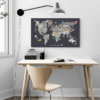 ลายแผนที่ เที่ยวทั่วโลก พื้นโลกและ พื้นหลังสีเทาเข้ม
