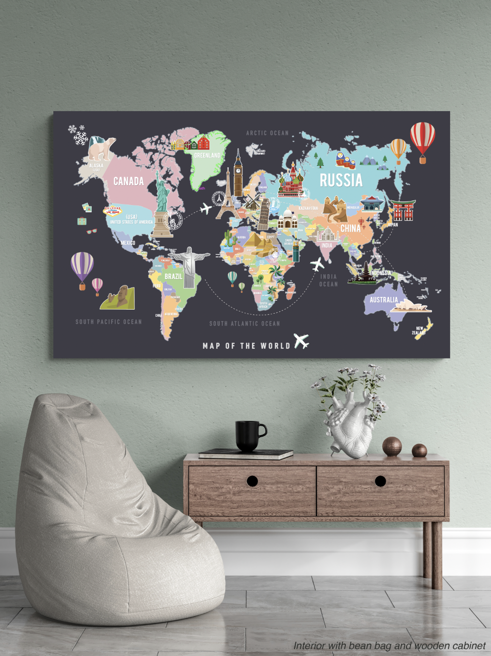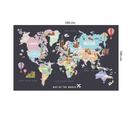 ลายแผนที่ เที่ยวทั่วโลก พื้นโลกสีสดใส แต่พื้นหลังสีเทาเข้ม