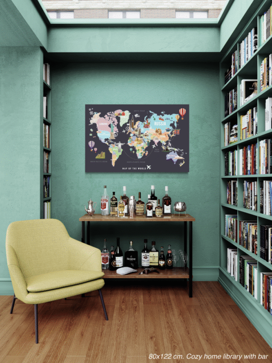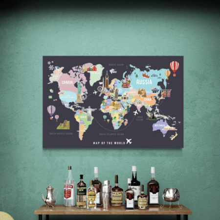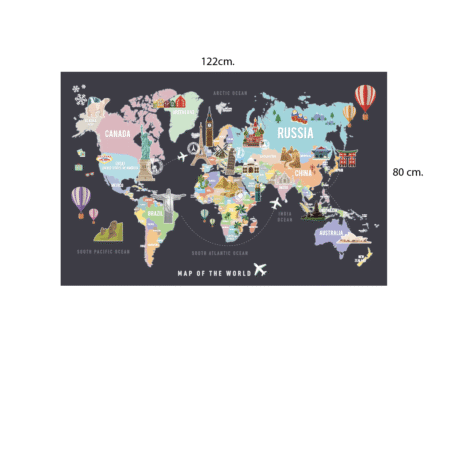 ลายแผนที่ เที่ยวทั่วโลก พื้นโลกและ พื้นหลังสีเทาเข้ม
